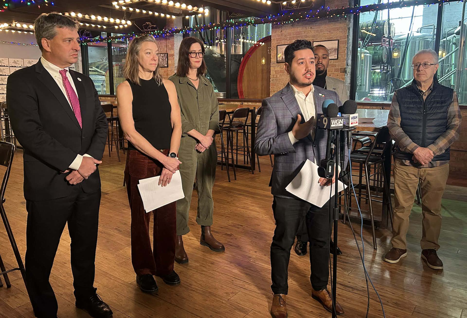 Members of the Chicago Alcohol Tax Coalition speak to the media at Off Color Brewing's The Mousetrap on Dec. 15, 2025. [Michael McDevitt/The Daily Line]