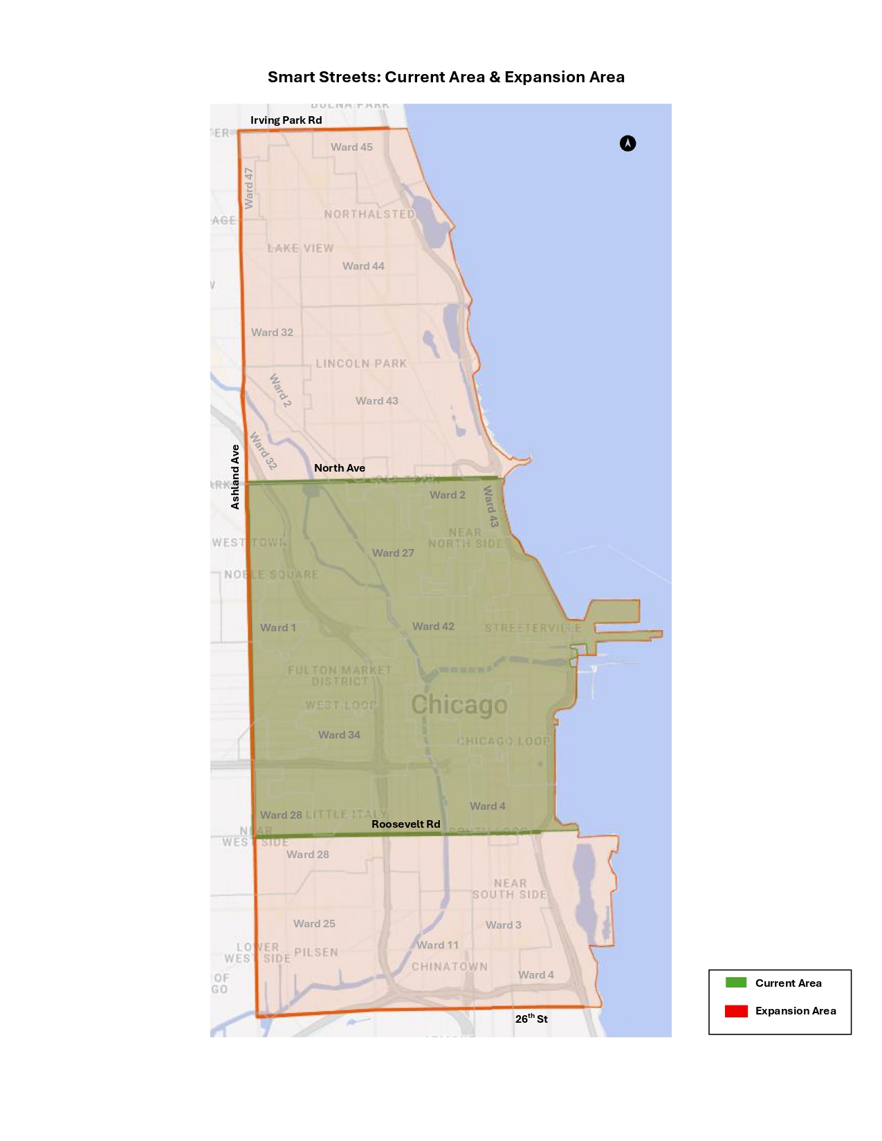 The current geographic boundaries of the pilot are Ashland Avenue on the west, North Avenue on the north, Roosevelt Road on the south and the lakeshore on the east. The eastern and western bounds of the pilot area would remain the same next year, but the northern boundary is set to expand to Irving Park Road, and the southern boundary would extend to 26th Street under the mayor’s current budget proposal.