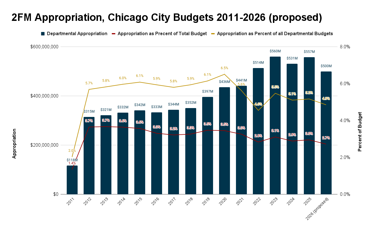 Corporate fund appropriations make up slightly more than half of 2FM’s budget, with the rest covered by smaller amounts from a broad range of local funds. The department also has $7.9 million in federal grant appropriations.