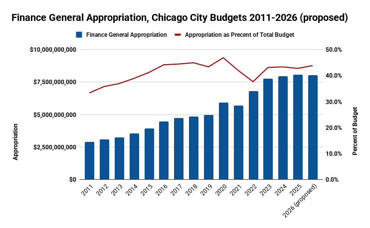 2025 Budgeted 2026 Proposed Net Change Percent Change Average Annual Rate of Change (2011-2025) Inflation-adjusted Rate of Change (2011-2024) Appropriations $8,065,669,719 $8,053,719,737 -$11,949,982 -0.15% 12.7% 8.1% - The proposed $12 million (-0.15%) reduction in finance general appropriations would be the first time since 2021 that finance general appropriations have declined from the previous year.
