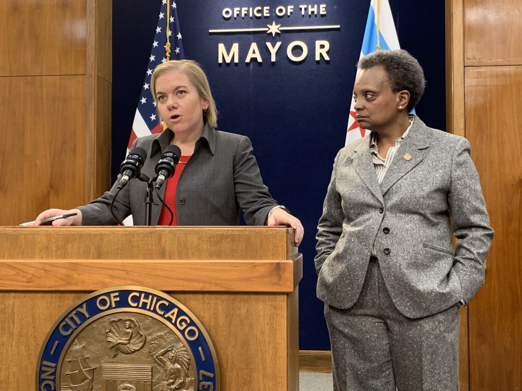 Dr. Allison Arwady answers reporters questions, as Mayor Lori Lightfoot looks on. [Heather Cherone/The Daily Line]
